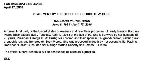 Falleció Barbara Bush, ex primera dama de EE.UU.