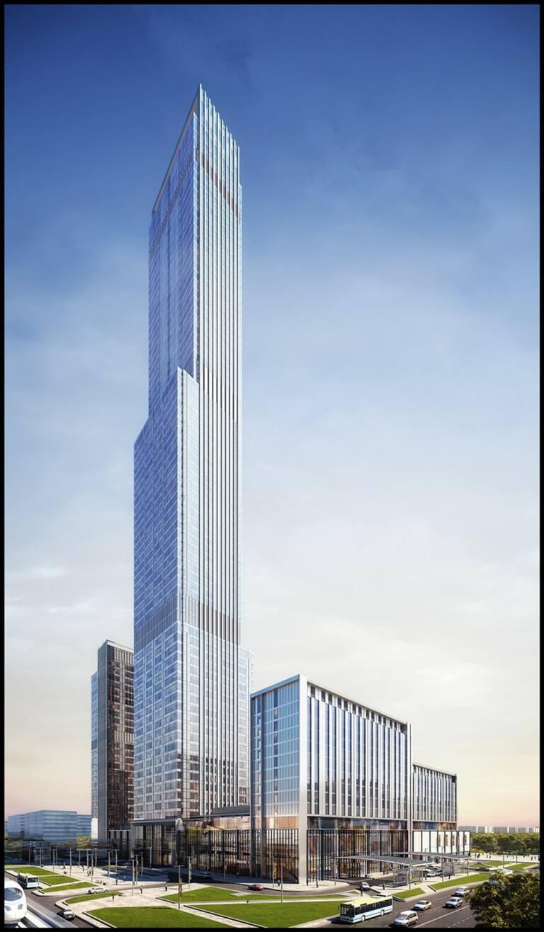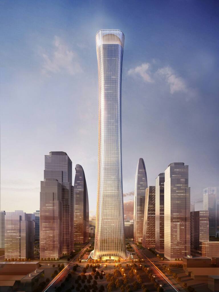 Un centro de negocios que tendrá un área de 30 hectáreas y 528 metros de altura – el segundo edificio más alto del norte de China una vez terminado. Serán 60 pisos para un espacio de oficinas, 20 para residencias y 20 destiando para un hotel.