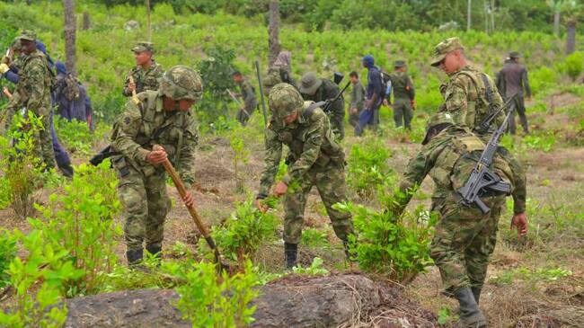 Entre erradicación de manera forzosa por la Fuerza Pública y sustitución de cultivos ilícitos de manera voluntaria se registran más de 67.000 hectáreas de coca retiradas, según reportan el Ministerio de Defensa y la Alta Consejería para el Posconflicto.