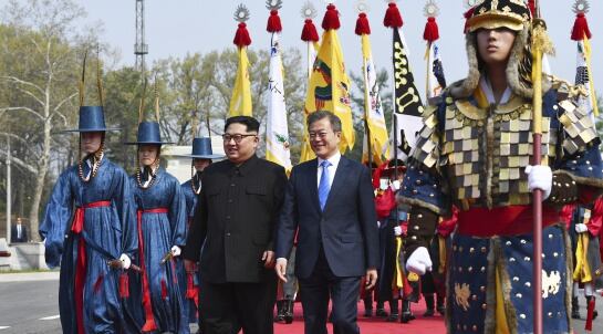 Con una guardia de honor fue recibido el líder de Corea del Norte, Kim Jong Un, en la zona desmilitarizada de Corea del Sur en donde llevan a cabo una cumbre histórica y que es apenas el tercer encuentro entre los líderes de esos dos países desde la Guerra de Corea en 1953.