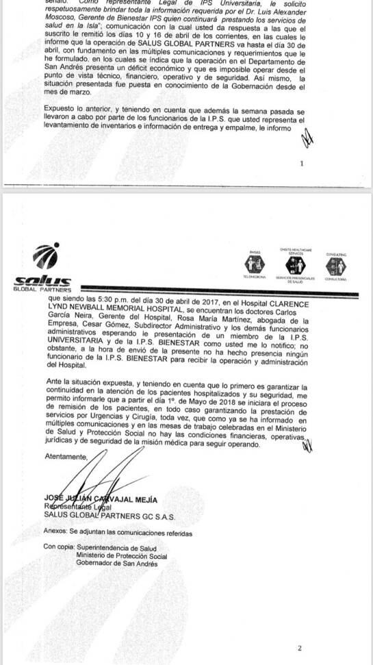 La firma reitera que Salus siempre ratificó que contaba con la experiencia de la red hospitalaria en San Andrés.