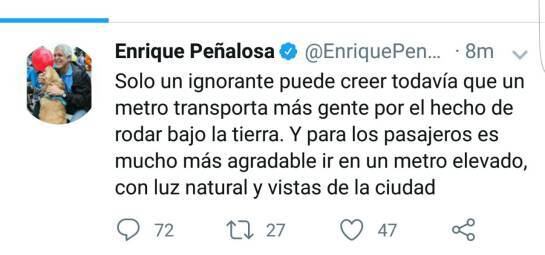 Una nueva desafortunada declaración dio el Alcalde de Bogotá, Enrique Peñalosa. El metro de Bogotá , de nuevo, fue el tema que causo las palabras del mandatario, el cual trató de ignorantes a aquellas personas que creen que un metro subterráneo permite transportar más gente.