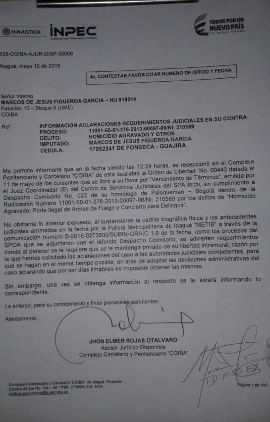 Este sábado el Inpec le notificó a Marcos de Jesús Figueroa alias Marquitos, en su celda y en la cárcel de Picaleña en Ibagué, una orden de libertad que un juez le concedió por vencimiento de términos.