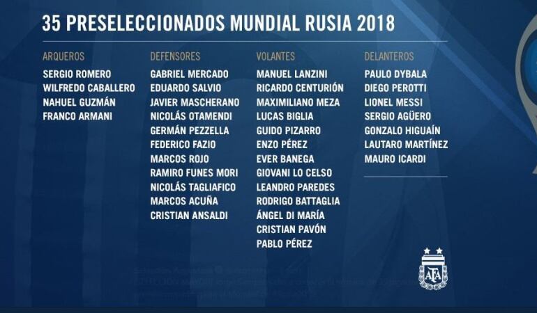 El portero de River Plate Franco Armani, el defensor del Torino Cristian Ansaldi, el centrocampista del Sporting Rodrigo Battaglia y el punta del Roma Diego Perotti son las sorpresas de la lista de 35 preseleccionados al Mundial de Rusia divulgada este lunes por el entrenador de Argentina, Jorge Sampaoli.