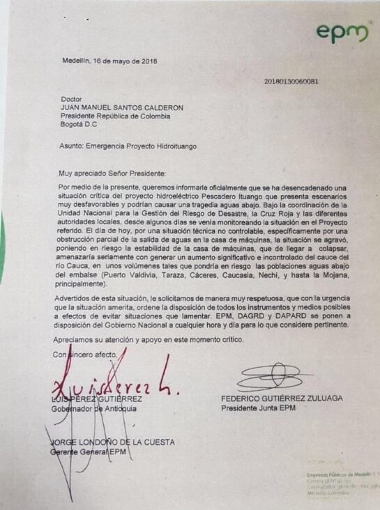 En carta, EPM y el gobernador de Antioquía piden a Santos que disponga de los medios necesarios para evitar una tragedia.