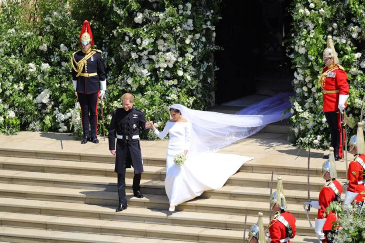 Markle, de 36 años, eligió un elegante y sobrio vestido blanco y un largo velo sujetado por una tiara.