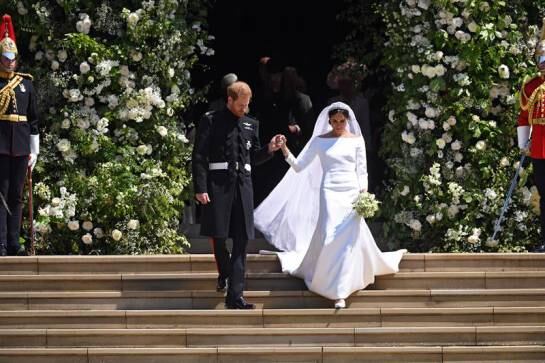 Markle lució un diseño muy sencillo, blanco inmaculado con escote de cuello de barco y cubrió su rostro con un velo transparente, adornado con bordados en los bordes hechos de organza y con una cola de cinco metros de longitud.