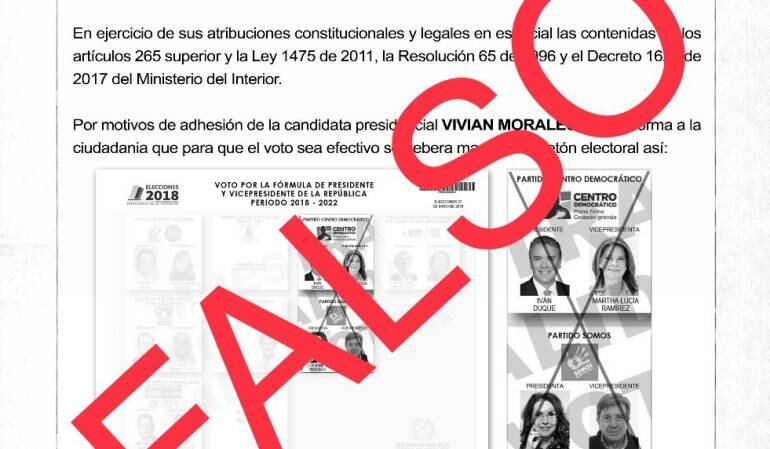 Se trata de una resolución falsa, que aparece firmada por la presidenta del CNE y en la que señalan que por la adhesión de Viviane Morales a la campaña uribista es necesario marcar las casillas con las caras de los dos aspirantes, lo que en realidad anula el voto.