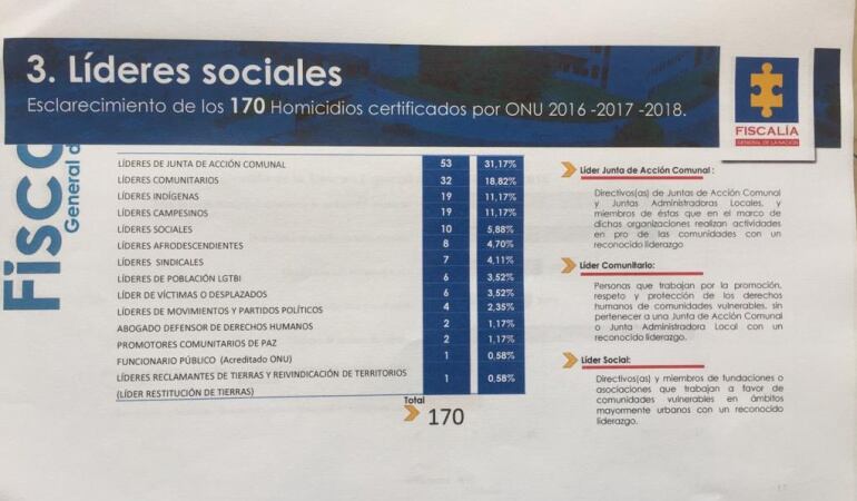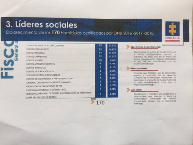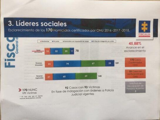 Al menos 170 son los líderes sociales asesinados desde 2016, según la Fiscalía. El problema es delicado y de acuerdo con el fiscal general Néstor Humberto Martínez, va en aumento.