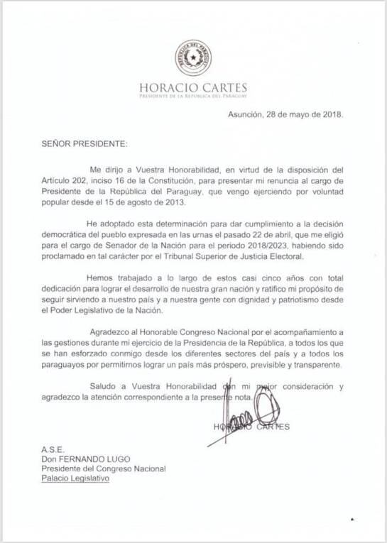 Cartes además comunicó su renuncia mediante una carta al presidente del Congreso, Fernando Lugo, en la que dice que se da "en cumplimiento a la decisión democrática del pueblo expresada en las urnas el pasado 22 de abril, que me eligió para el cargo de Senador de la Nación para el periodo 2018/2023".