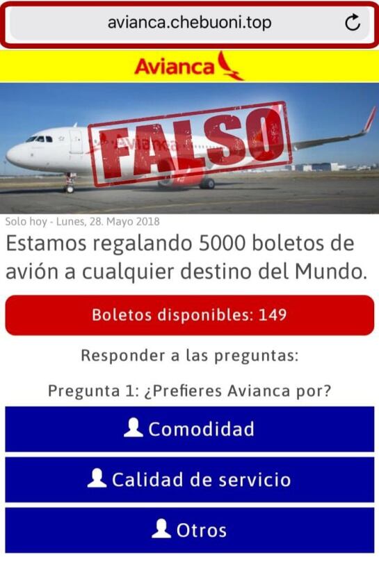 Luego que en las últimas horas circulará por redes sociales una cadena en que Avianca está regalando 5.000 boletos de avión para cualquier destino del mundo y en donde afirma que hay disponibles 149, y pide responder tres preguntas como son: ¿prefieres Avianca por servicio, comodidad y calidad de servicio?, la Aerolínea acaba de desmentir esta encuesta.
