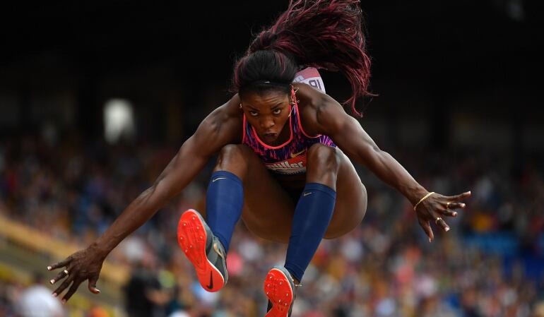 La deportista de 34 años, se trepó al primer lugar con una marca de 14.89, por delante de Tori Franklin quien registró 14.57 y Kimberly Williams, quien saltó 14.50.