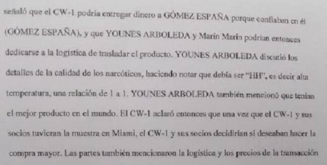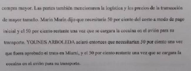 La muestra de coca la acordaron en un hotel de Bogotá donde Marín garantizó la seguridad, supuestamente allí se hicieron otras transacciones relacionadas con narcotráfico. Fue en ese sitio donde también se pactó la forma de pago: 50% como anticipo y el resto cuando la droga estuviera en un avión rumbo a los Estados Unidos.