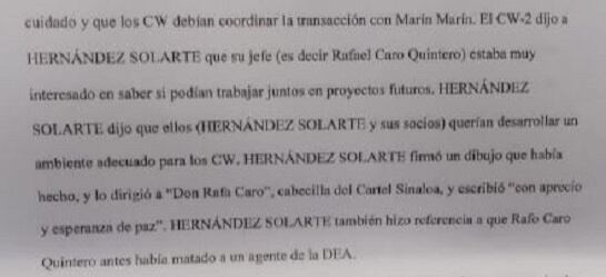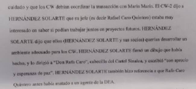 El nombre de Santrich aparece en el informe de la DEA en una reunión que supuestamente sostuvieron en su casa y en noviembre de 2017. Los falsos narcotraficantes aseguraron que su jefe, Rafael Caro Quintero, supuesto narco del Cartel de Sinaloa, estaba muy interesado en mantener “negocios” en el futuro, Santrich como respuesta le envió un dibujo con un curioso mensaje “con aprecio y esperanza de paz”.