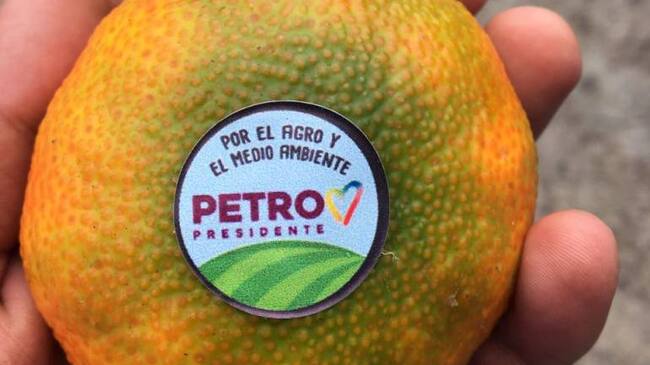 La fruta tenía pegado el logo de Colombia Humana y se entregaba con un mensaje de apoyo al agro y al medio ambiente, asegurando que la mandarina no contamina, es dulce y representa la propuesta de Petro.