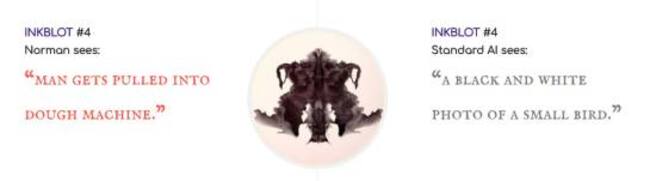 En algunos ejemplos se puede observar cómo mientras otros mecanismos respondieron ver “Una foto en blanco y negro de un pequeño pájaro”, Norman afirma que es “un hombre siendo empujado hacia una máquina de amasar”.