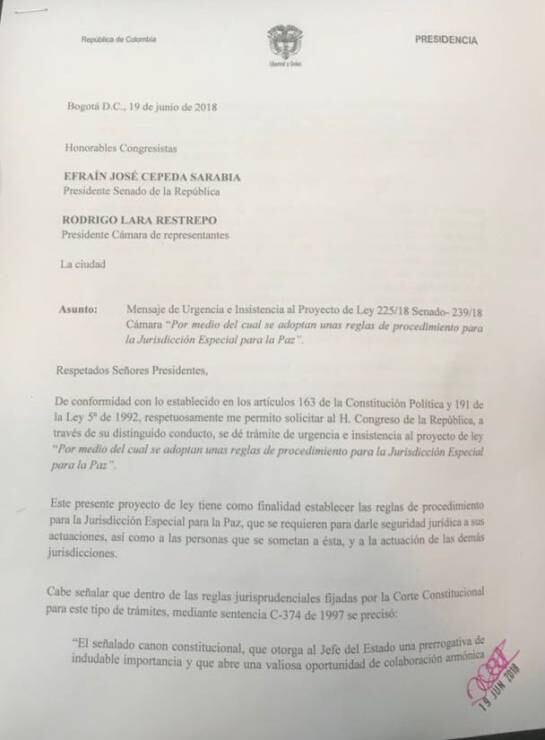 El Gobierno envió en la tarde de este martes a los presidentes del Senado, Efraín Cepeda y de la Cámara, Rodrigo Lara, un nuevo ‘Mensaje de Urgencia e Insistencia’ para el proyecto de reglamentación de la JEP.