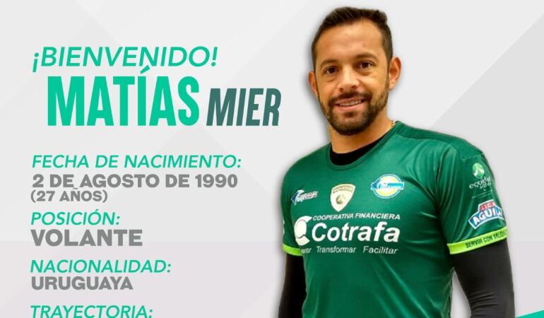 Equidad confirmó al uruguayo Matias Mier como su nuevo refuerzo para la próxima temporada, volante que llega proveniente del Atlético Junior donde estuvo durante un año.