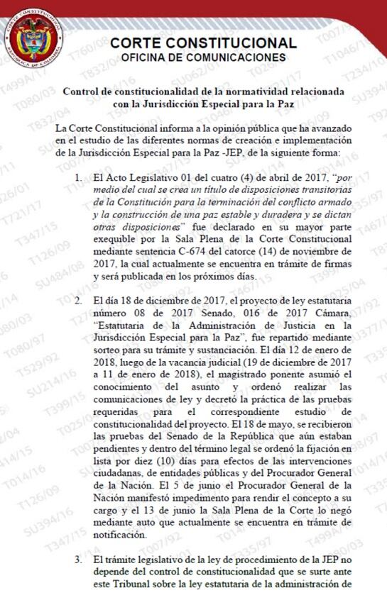 Por medio de un comunicado la Corte aclaró los alcances de su posición frente a la reglamentación de la jurisdicción que se discutirá en el congreso en sesiones extraordinarias del 21 de junio al 3 julio.