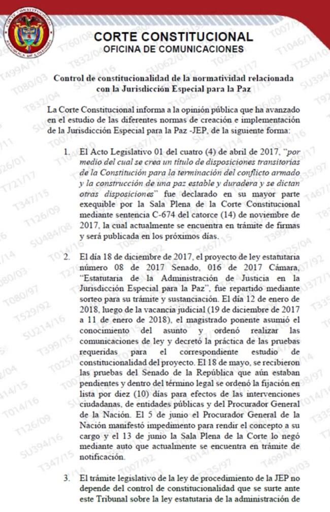 La Corte Constitucional aseguró que no se necesita que falle primero sobre la ley estatutaria de la Justicia Especial de Paz, para que el Congreso pueda tramitar y aprobar esa ley de procedimiento.