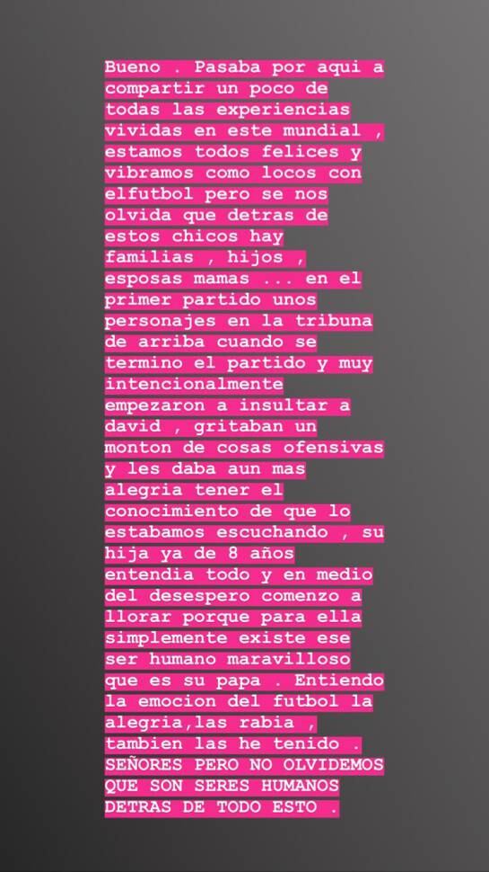 La modelo y empresaria Daniela Ospina por medio de su cuenta de Instagram comentó lo qué pasó durante el partido de la Selección Colombia frente a Japón, “Estamos todos felices y vibramos como locos con el fútbol. Pero se nos olvida que detrás de estos chicos hay familias, hijos, esposas, mamás… En el primer partido unos personajes en la tribuna de arriba cuando terminó el partido y muy intencionalmente empezaron a insultar a David. Gritaban un montón de cosas ofensivas y les daba aún más alegría tener conocimiento de que lo estamos escuchando”.