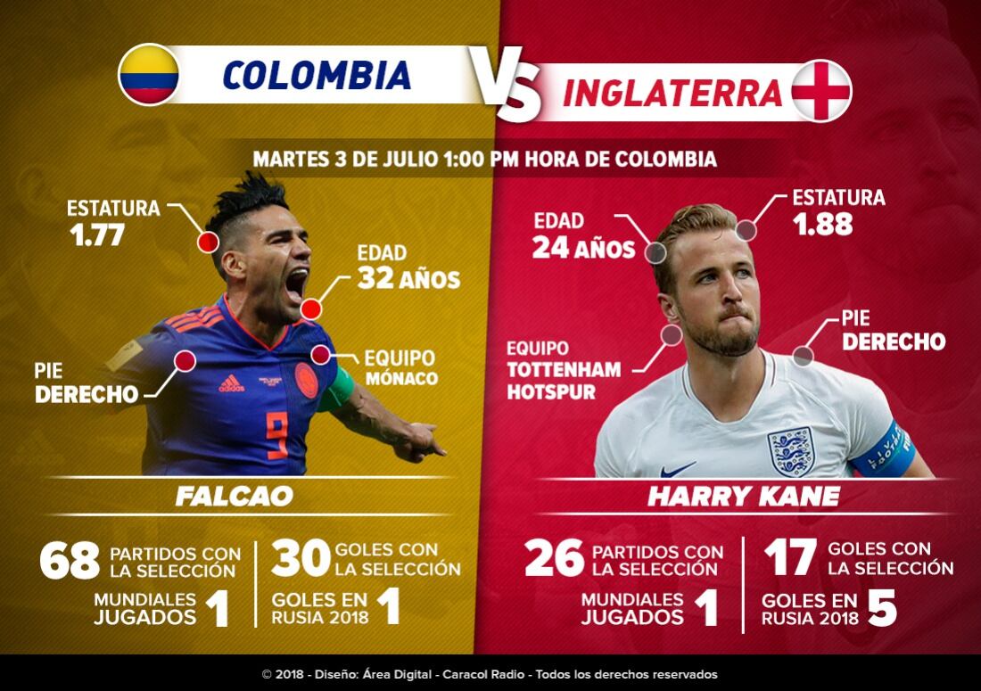 Radamel Falcao García y Harry Kane protagonizan el duelo personal más atractivo del encuentro entre las selecciones de Colombia e Inglaterra, equipos que se enfrentarán este martes por los octavos de final del Mundial de Rusia 2018. El ganador de esta llave se enfrentará en cuartos de final al vencedor del juego entre Suecia y Suiza.