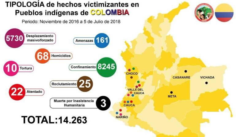 En el marco del encuentro, la ONIC denunció que en los últimos dos años son 14.263 los hechos victimizantes al pueblo indígena en Colombia, dentro de las cifras que presenta el Sistema de Información Consejería de Derechos de los pueblos Indígenas se destacan: 68 homicidios, 161 amenazas, 10 torturas, 8.245 casos de confinamiento y más de 5.000 desplazamientos.