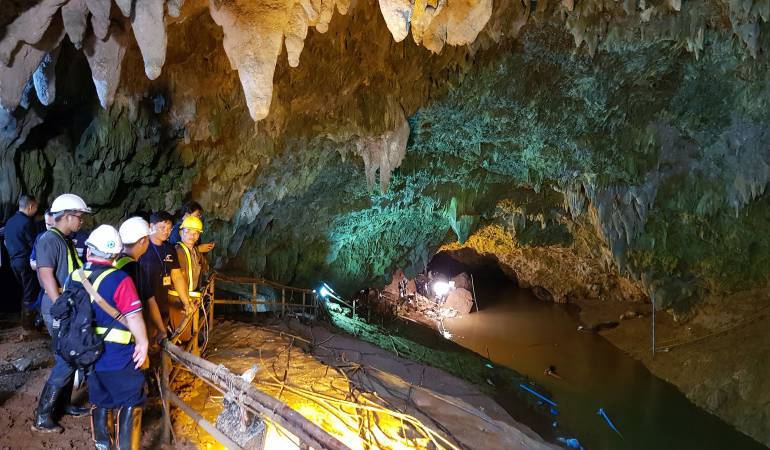 Los miembros de salvamento, junto a los niños, tienen que superar un complejo de laberínticas galerías parcialmente inundadas y con desniveles y visibilidad nula para alcanzar la boca exterior de la cueva.