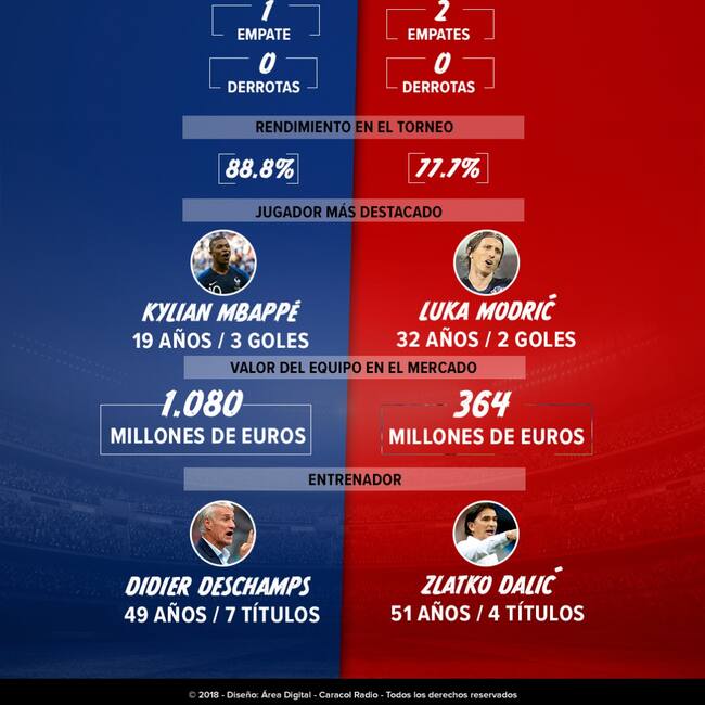 Esta será la segunda ocasión en que el equipo galo disputará el partido decisivo del certamen; mientras que Croacia jugará su primera final en la historia de la Copa del Mundo.