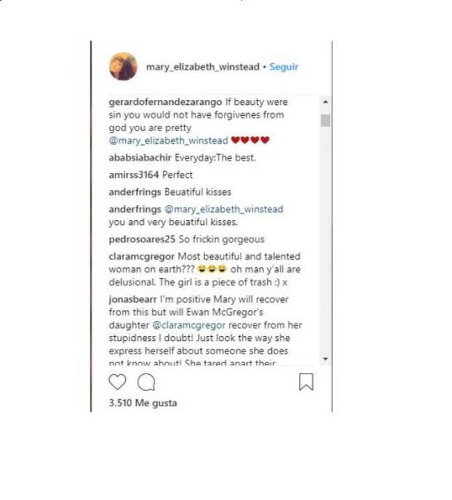 Clara Mcgregor, la hija del actor, no se pudo contenerse y escribió “¿Muy hermosa y mujer con más talento en la tierra? Oh hombre, todos ustedes son delirantes. La chica es un pedazo de basura”.