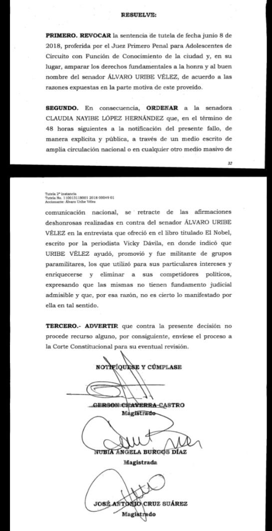 Otra vez el Tribunal Superior de Bogotá ampara el derecho al buen nombre del senador y ex presidente Álvaro Uribe y ordena a la senadora López que en un plazo de 48 horas emita una retractación de sus declaraciones en el libro El Nobel de la periodista Vicky Dávila.