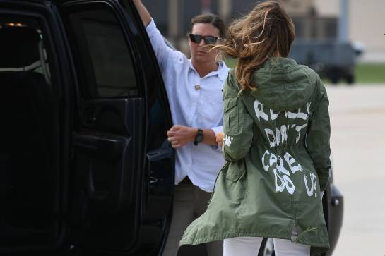 La chaqueta que Melania Trump escogió para su viaje del pasado 21 de junio llevaba impresas las palabras: "Realmente no me importa. ¿Y a ti?", que provocaron gran indignación a pesar de que el presidente del país, Donald Trump, dijo después que el mensaje iba dirigido a los medios de comunicación.