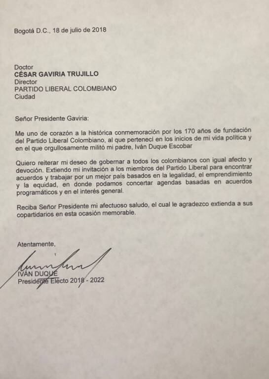 Duque le reitera al expresidente Gaviria la invitación a trabajar por el bien común de Colombia bajos las premisas que enarbola el Partido Liberal .