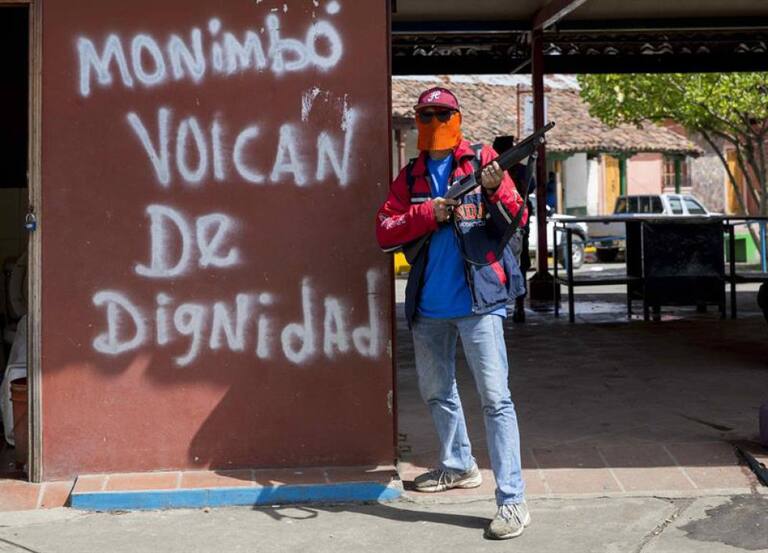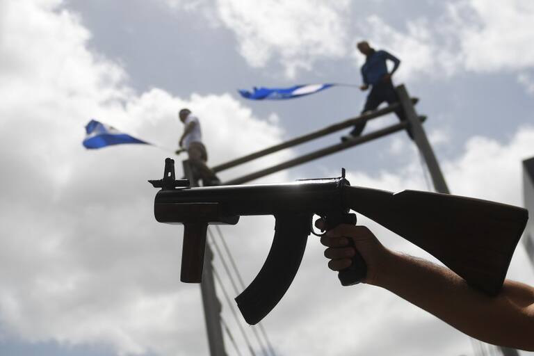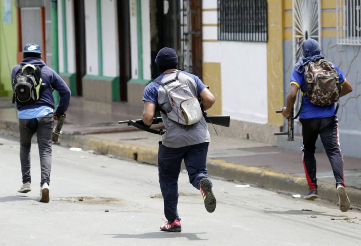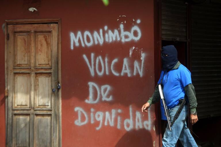 • Un paramilitar camina junto a una grafitti que dice 'Monimbo, volcán de la dignidad' en el barrio de Monimbo en Masaya, Nicaragua, luego de enfrentamientos con manifestantes antigubernamentales.