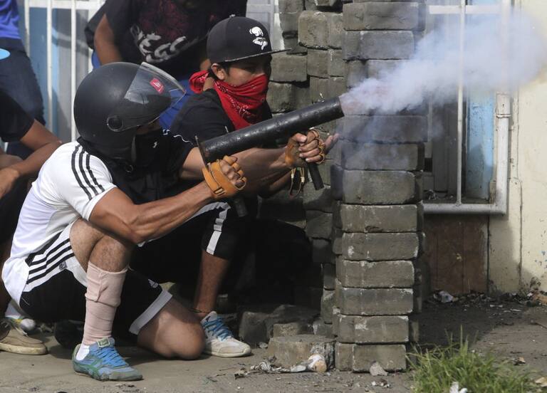 • Un manifestante antigubernamental dispara un mortero casero durante los enfrentamientos con la policía antidisturbios en una barricada en la ciudad de Masaya