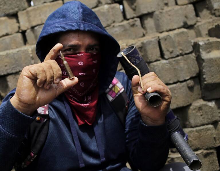 • Un manifestante antigubernamental sostiene su mortero casero, durante enfrentamientos con la policía antidisturbios y miembros de la juventud sandinista en Masaya