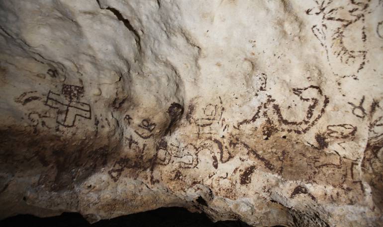 Las pinturas están impresas en una roca de aproximadamente 15 metros de largo y cinco de alto en esa cueva hallada en la parte oriental del estado de Yucatán, en el sureste de México, que también alberga un pequeño cenote de aguas azules.