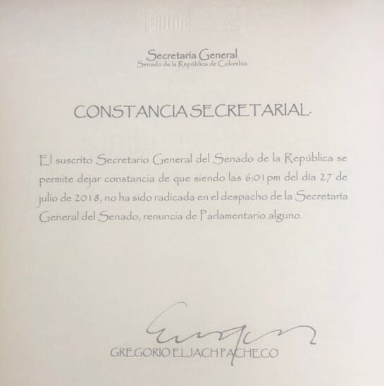 Por esa razón Gregorio Eljach elaboró una constancia en la que afirma que no se radicó la carta de Iván Márquez y ese sería el paso previo para remitir el caso al Consejo de Estado.