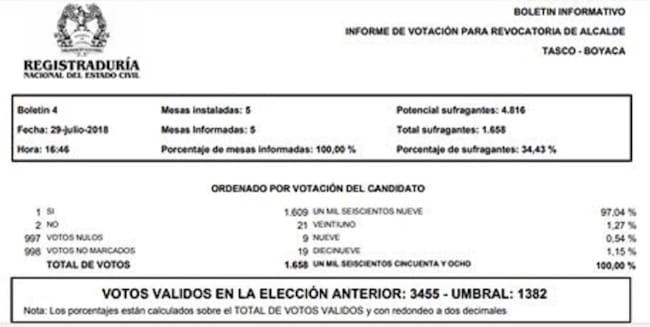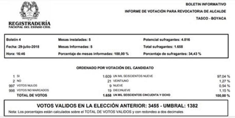 Desde hace 26 años existe en Colombia la revocatoria de alcaldes, pero es la primera vez que este mecanismo se hace efectivo. El caso se presentó en el municipio de Tasco, Boyacá, en donde los habitantes acudieron a las urnas para tomar una decisión que finalmente fue mayoritariamente por el Sí.