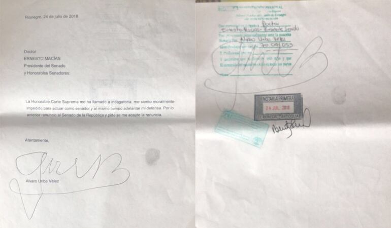 El ex presidente Álvaro Uribe dio marcha atrás en su intención de renunciar a su curul en el Congreso de la República y le pidió al presidente del Senado, Ernesto Macías, que retenga su carta de dimisión.