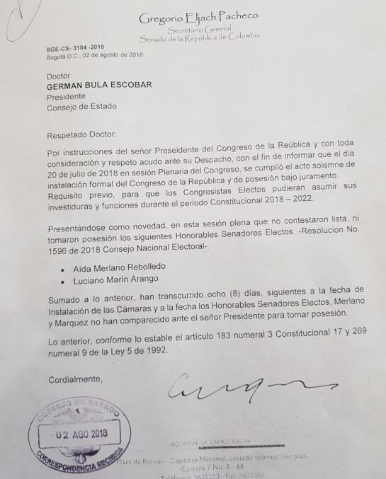 El secretario general del Senado envió al alto tribunal una comunicación señalando que ni Márquez ni Merlano se posesionaron y en ese orden de ideas debe empezar el proceso de pérdida de investidura para los dos.