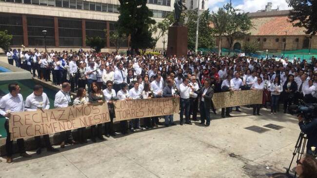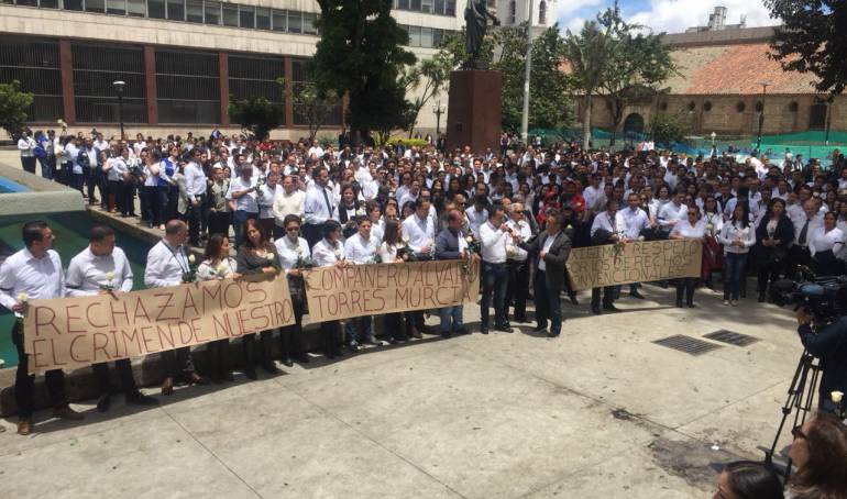 Antes de este mediodía los trabajadores del Banco de la República, todos con camisas blancas y rosas se concentraron en el Parque Santander para rechazar el asesinato de Alvaro Torres Murcia, el hombre que fue asesinado durante la noche del jueves en medio de un atraco en el centro de Bogotá.