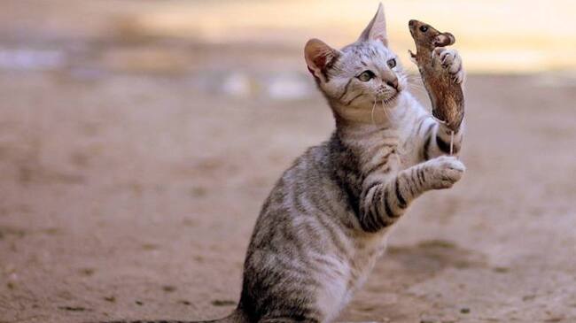 En este el gato abraza al ratón (quien sería su comida normalmente) y lo empieza a lamer por un buen rato.