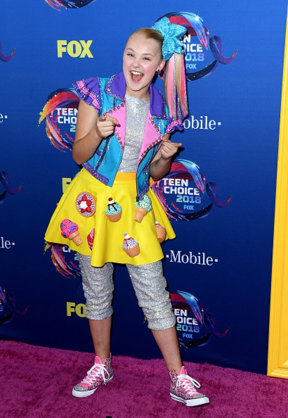 JoJo Siwa, vistió muchos colores. En su falda se hace evidente el uso de adornos inspirados en helados y dulces- En cuanto al cabello, también lo llevó recogido y con tonos rosados. Jojo evidentemente buscaba impactar y estar cómoda.