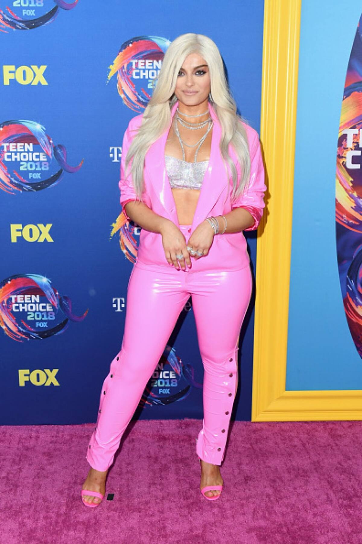 Bebe Rexha, usó un conjunto en latex rosa. La cantante optó por el cabello suelto y un maquillaje que resaltaba sus grandes ojos.