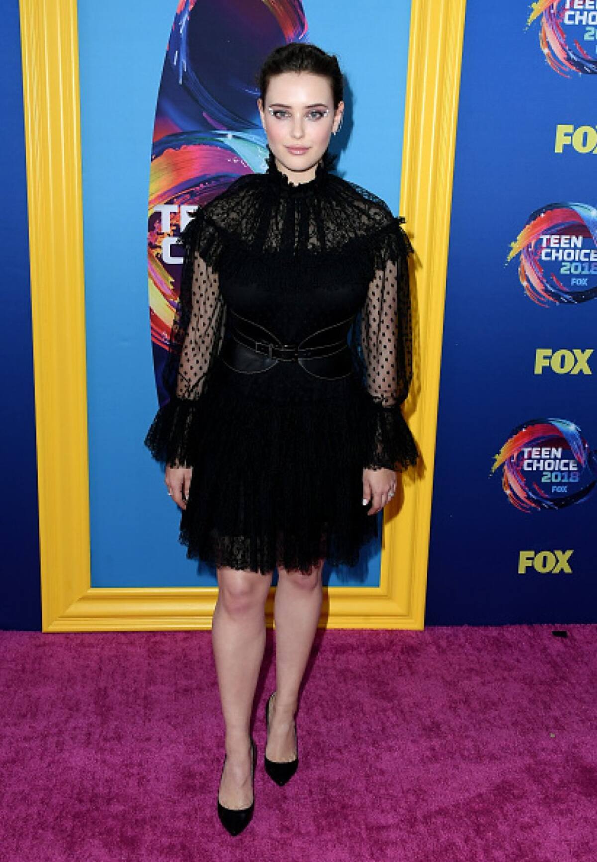 Katherine Langford, la protagonista de 13 razones por qué, llevó un traje de velos negro con una falda a la rodilla. Los zapatos complementaban el elegante vestido. Katherine, en su maquillaje resaltó sus ojos con estrellas.