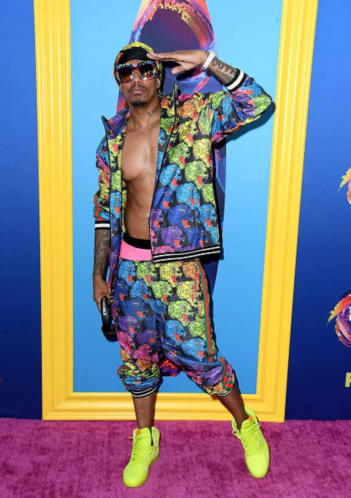 Nick Cannon, luciendo un conjunto de estampados y colores complementado con unos zapatos verde limón que resaltaban su versatilidad