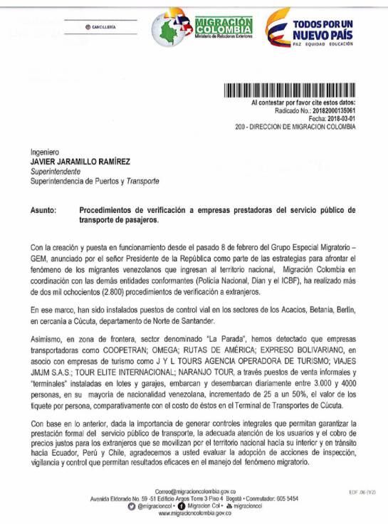 En la carta, el director de Migración confirma que a través de operativos conjuntos con la Policía Nacional en zona de frontera con Venezuela, en el sector denominado como "La Parada", empresas transportadoras instalaron puestos improvisados en garajes y lotes, para movilizar a personas, en su mayoría venezolanas, que llegaban a Colombia con destino hacia países como Ecuador, Perú y Chile.