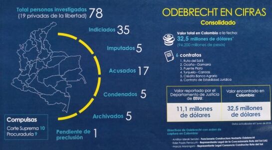 Al menos 73 son investigados, están imputación o indagación preliminar, como el ex presidente de la Agencia Nacional de Infraestructura, Luis Fernando Andrade. 17 se encuentra en juicio como José Elías Melo, ex presidente de Corficolombiana y el ex congresista Otto Bula.