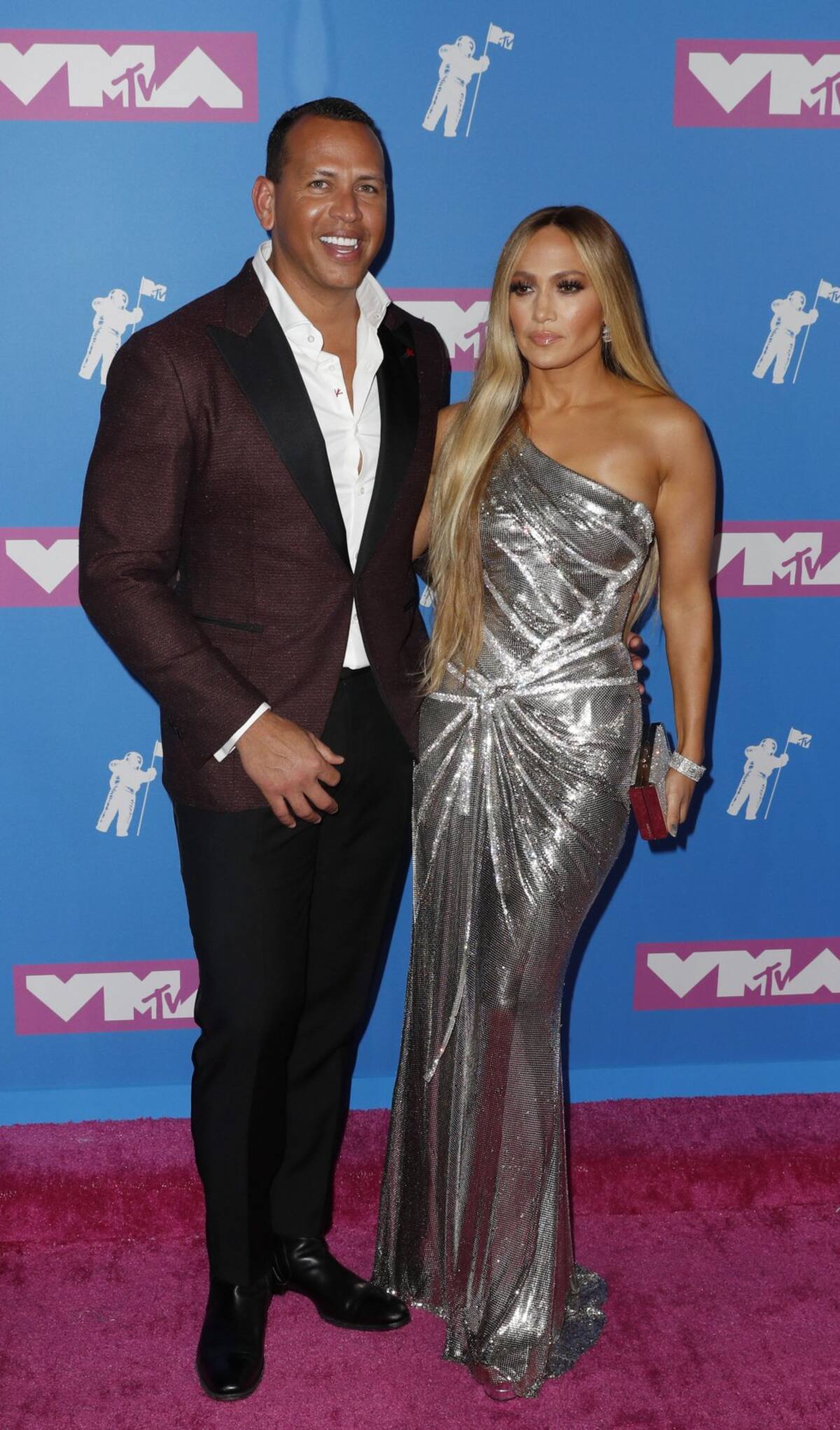 La cantante estadounidense Jennifer Lopez (d) posa con el exjugador de béisbol Alex Rodriguez